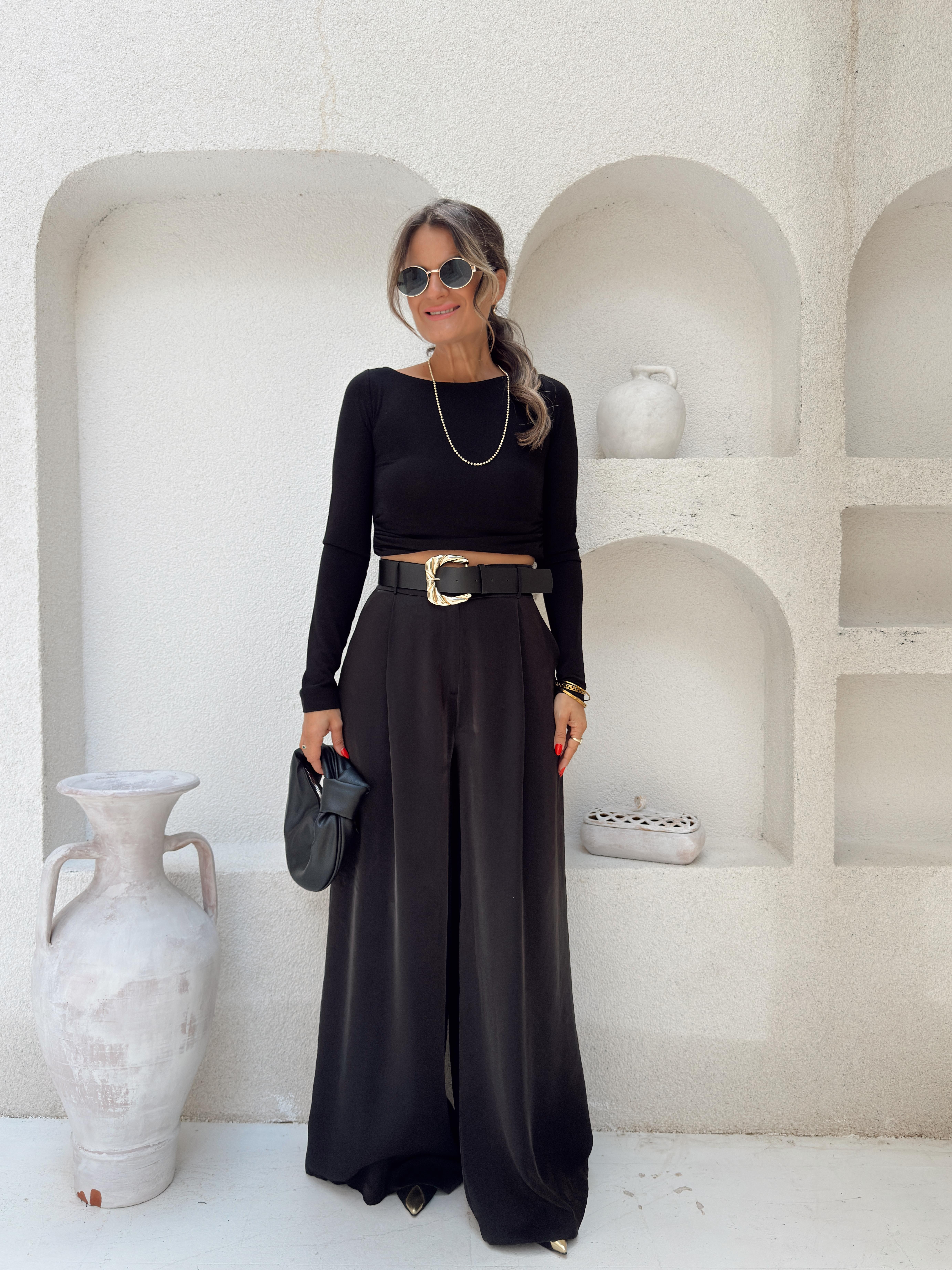 Nişantaşı Butik YÜKSEK BEL KEMERLİ BOL PAÇA SİYAH JAKARLI PANTOLON