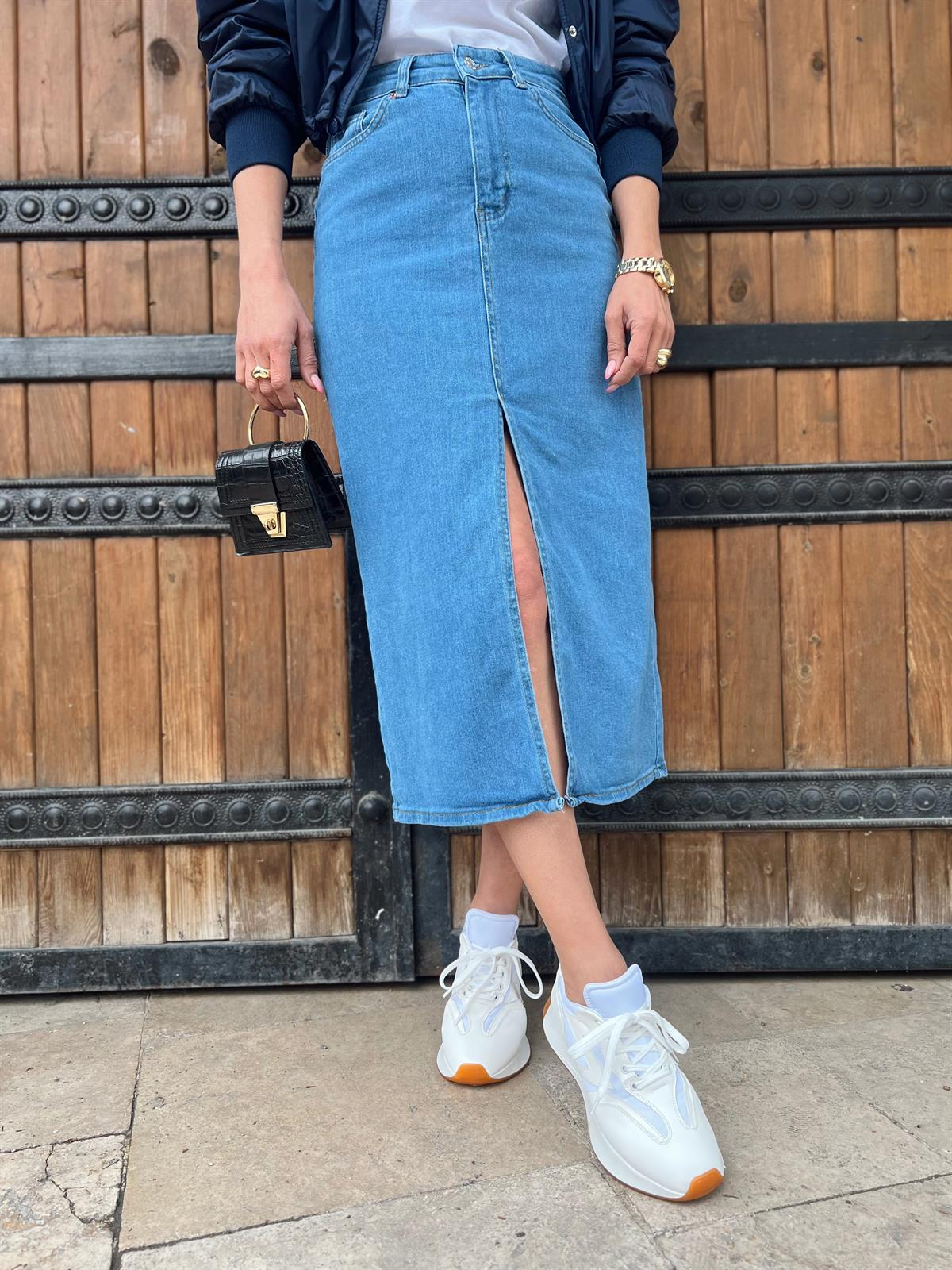 YÜKSEK BEL YIRTMAC DETAY MAVİ KOT ETEK (ETK390)